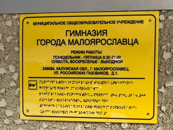 - Входные двери в МОУ Гимназия г. Малоярославца промаркированы специальными знаками (желтыми кругами) для беспрепятственного прохода. Входы в здания оснащены поручнями, а ступени лестниц безопасным противоскользящей полосой. Первые и последние ступени лестницы каждого пролета промаркированы контрастной желтой полосой для обозначения её габаритов